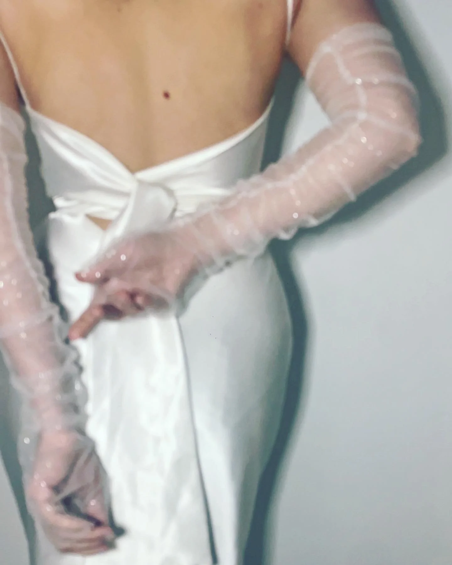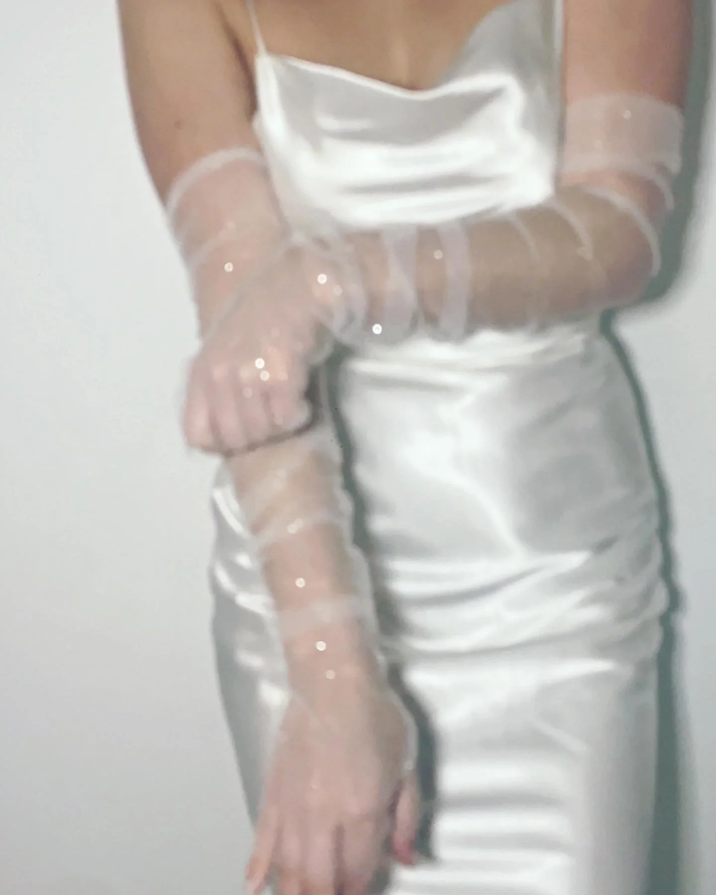 Enhance your bridal or wedding reception attire with these timeless tulle gloves. They are made with a soft white tulle adorned with delicate silver sparkles. Perfect for completing any look and adding that extra hint of drama.